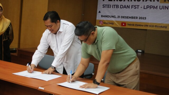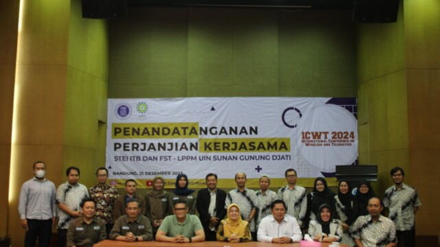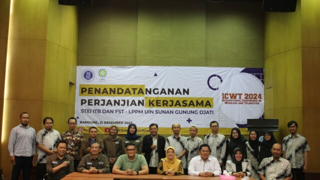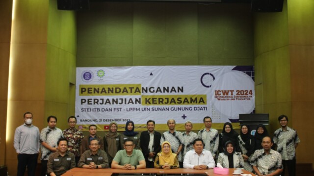 Bandung (21/12) Kegiatan Penandatangan Kerjasama antara ITB dan UIN Sunan Gunung Djati Bandung dalam rencana kegiatan ICWT 2024 (The International Conference on Wireless and Telematics) dilaksanakan di Kampus ITB Jatinangor, kamis, 21 Desember 2023, hadir dalam kesempatan tersebut, Dekan STEI (Sekolah Teknik Elektro dan Informatika) ITB, Dr. Tutun Juhana, M.T., Dekan Fakultas Sains dan Teknologi UIN Sunan Gunung Djati Bandung, Prof. Dr. Hasniah Aliah, M.Si, Kepala Pusat Penelitian dan Penerbitan LPPM UIN Sunan Gunung Djati Bandung, Prof. Dr. Deni Miharja, M.Ag., Wakil Dekan III Fakultas Sains dan Teknologi, Undang Syarifudin, M.Kom., Kabag TU Fakultas Sains dan Teknologi, Ati Rahmawati, M.Ag, Ketua dan Sekretaris Jurusan Teknik Elektro UIN Sunan Gunung Djati Bandung, Dosen Jurusan Teknik Elektro dan Dosen STEI ITB.